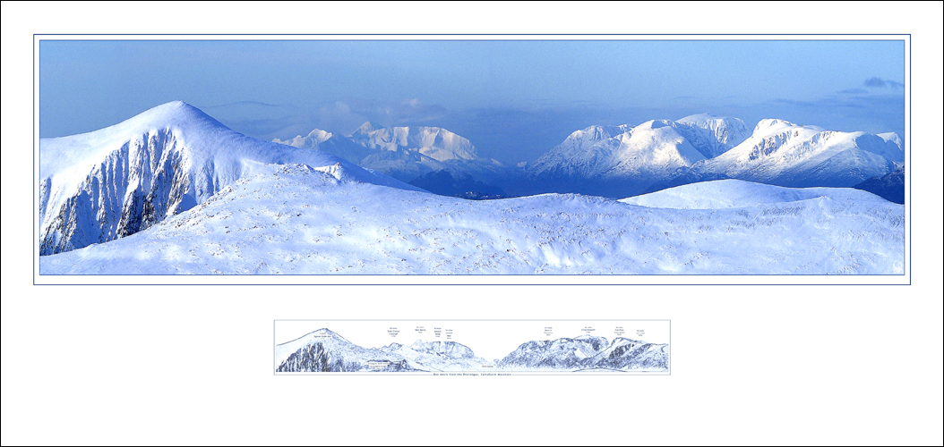 This picture is a copy of one of the three view interpretation boards located on the terrace of the Ptarmigan Restaurant, at 1097m just below the summit of Cairngorm Mountain.