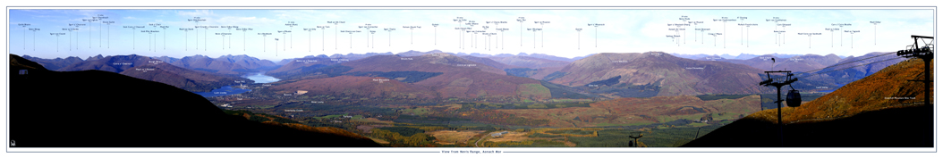 View from the terrace of the Snowgoose Restaurant at the top of the Nevis Range gondola on Aonach Mor. Includes legend information detailing mountain names and heights on the picture.