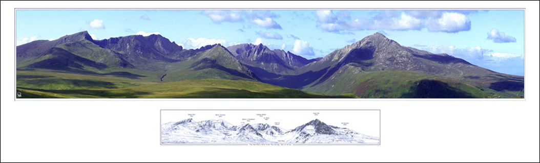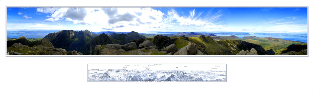 a 360 degree panorama taken from the summit of Caisteal Abhail, showing Goat Fell and Coir Mhor in the foreground. Picture completed using 7 separate photographs.