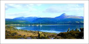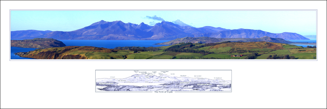 Picture looking towards Arran taken from above the Healy Brae Largs, with Cumbrae in the foreground. Created using 16 separate photographs.